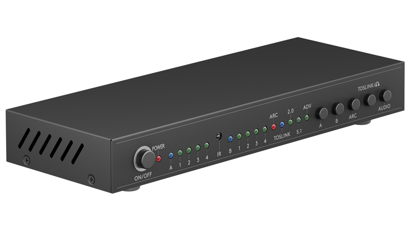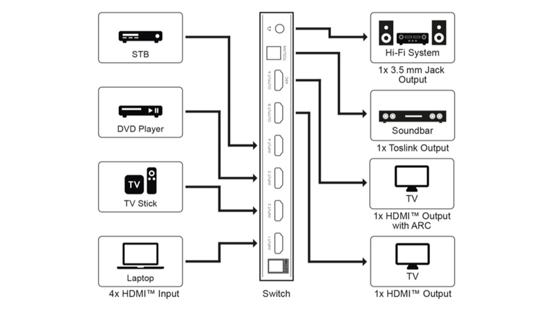 Conmutador de HDMI de seis puertos que posibilita la conexión de cuatro dispositivos HDMI a dos pantallas distintas